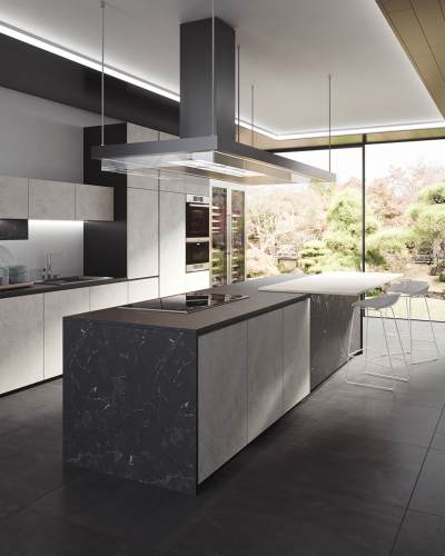 The roughness of grey concrete background in the AURINA décor – inspired by the rocky mountain characteristic of North East Italy – is flanked by the showiness of the MARQUINIA surfaces which enhance the timeless charm of black marble.
