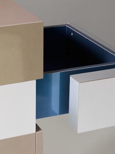 Sur la surface extérieure, le décor Arpa® Brown Shot, en finition Lucida, et le stratifié métallique Homapal® Plex Aluminium préservent leur pureté et évoluent selon la lumière et le point de vue. À l’intérieur des tiroirs, l’Arpa® Blue Shot en finition Lucida crée une continuité avec l’extérieur, introduisant un détail inattendu.