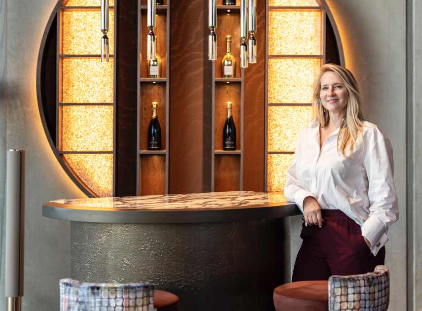 Lo champagne bar è impreziosito dalla finitura applicata alle armadiature Sunlight Lucida che fa parte della famiglia di pattern Arpa. Il decorativo è stato scelto per le sue tonalità calde e perché si armonizzava con gli accenti color ambra, bronzo e marrone scuro presenti nello spazio. “La luce del sole conferisce morbidezza ed equilibrio agli audaci interventi architettonici e contribuisce alla creazione dell’atmosfera intima e invitante dello spazio The Skyline. Il decorativo aggiunge un calore naturale che bilancia gli elementi più scenografici del progetto”, ha spiegato lo studio olandese.